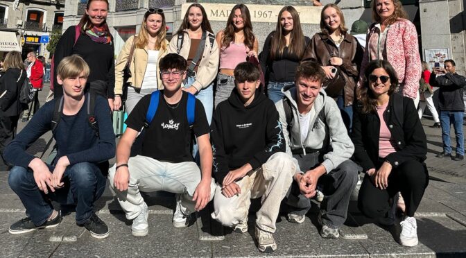 Der fortgeführte Spanischkurs der Einführungsphase verbrachte vom 02. bis 08. November 2025 eine erlebnisreiche Woche in Madrid. Begleitet von den Spanischlehrkräften Frau Haustein, Frau Fundermann und Frau Corneli vertieften die Schülerinnen und Schüler ihre Spanischkenntnisse und sammelten vielfältige kulturelle sowie kulinarische Erfahrungen.