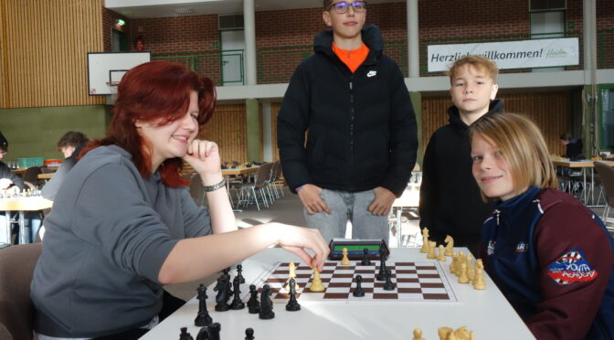 Am 17.11 haben wir – nach einem erfolgreichen Auftakt im letzten Jahr – wieder mit einer Mannschaft bei den Kreismeisterschaften im Schulschach teilgenommen. Mitgespielt haben Hermann Finke (8d), Johann Brunsbach (7c), Sofie Klinkenberg-Anders (8d) sowie Oliver Romacker (7c). Unsere Mannschaft konnte gut vorlegen und gewann die ersten 3 Kämpfe. Nach der Pause ging es gegen den späteren Erstplatzierten, das Euregio-Gymnasium aus Bocholt, wo wir hoch verloren haben. Zwar gewannen wir die weiteren drei Spiele, allerdings konnten wir das Euregio nicht mehr aufholen und kamen somit auf einen sehr zufriedenstellenden 2. Platz. Sofie holte insgesamt 5 Punkte aus ihren 7 Partien, Johann 5,5 Punkte, Oliver 6 Punkte und Hermann sogar 6,5 von 7 Punkten, sodass alle mit guten Ergebnissen zum Erfolg der Mannschaft beitrugen.